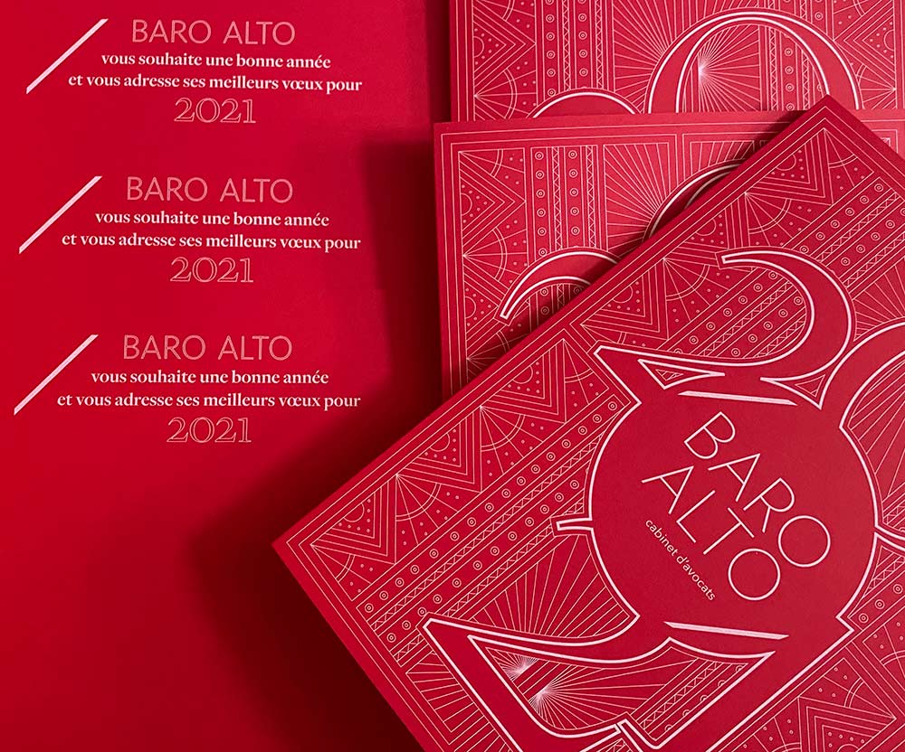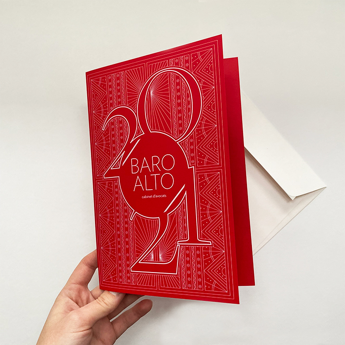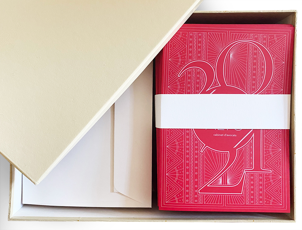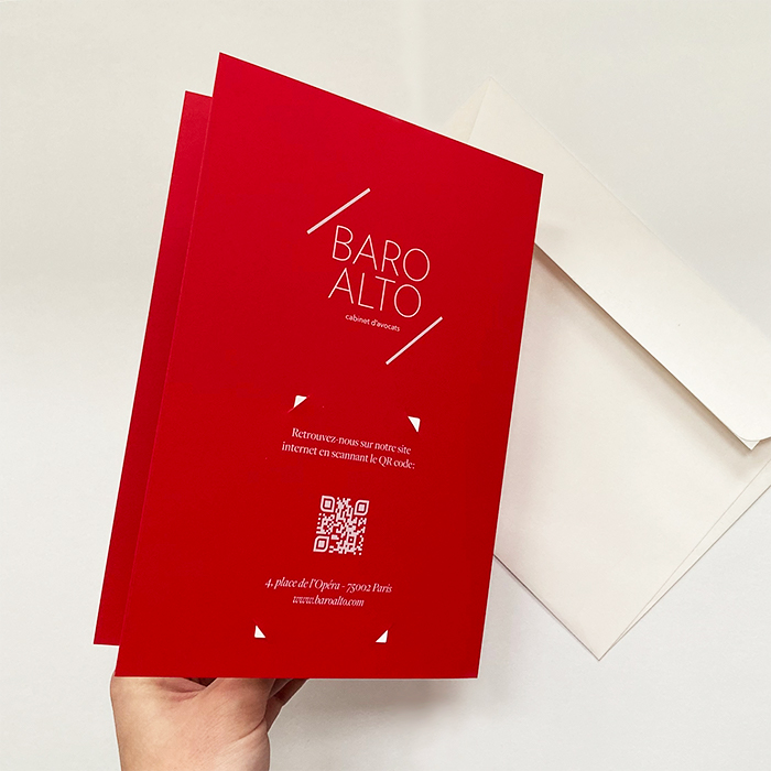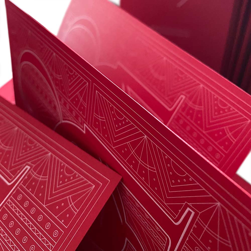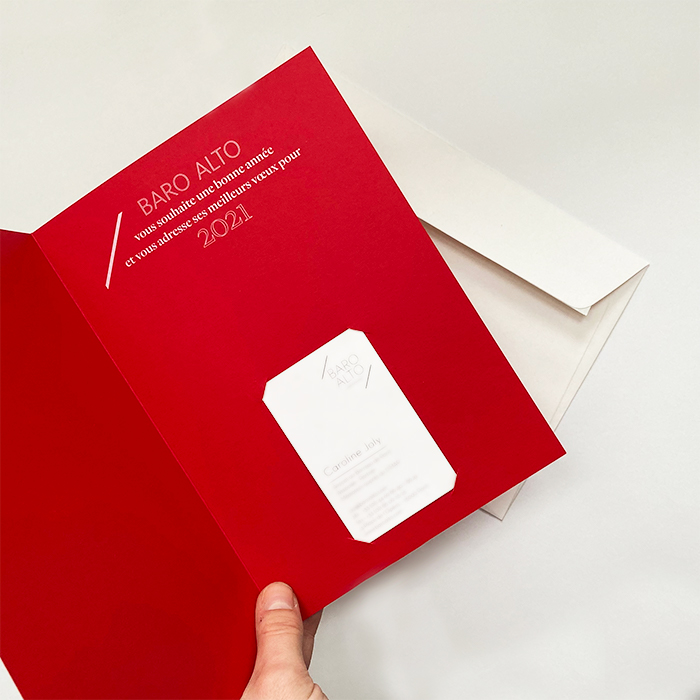 La carte est imprimée en blanc sur papier rouge Curious Skin en 270g. Les enveloppes ont été choisies dans la gamme de papier Curious Metallics, Cryogen White, en 120g.