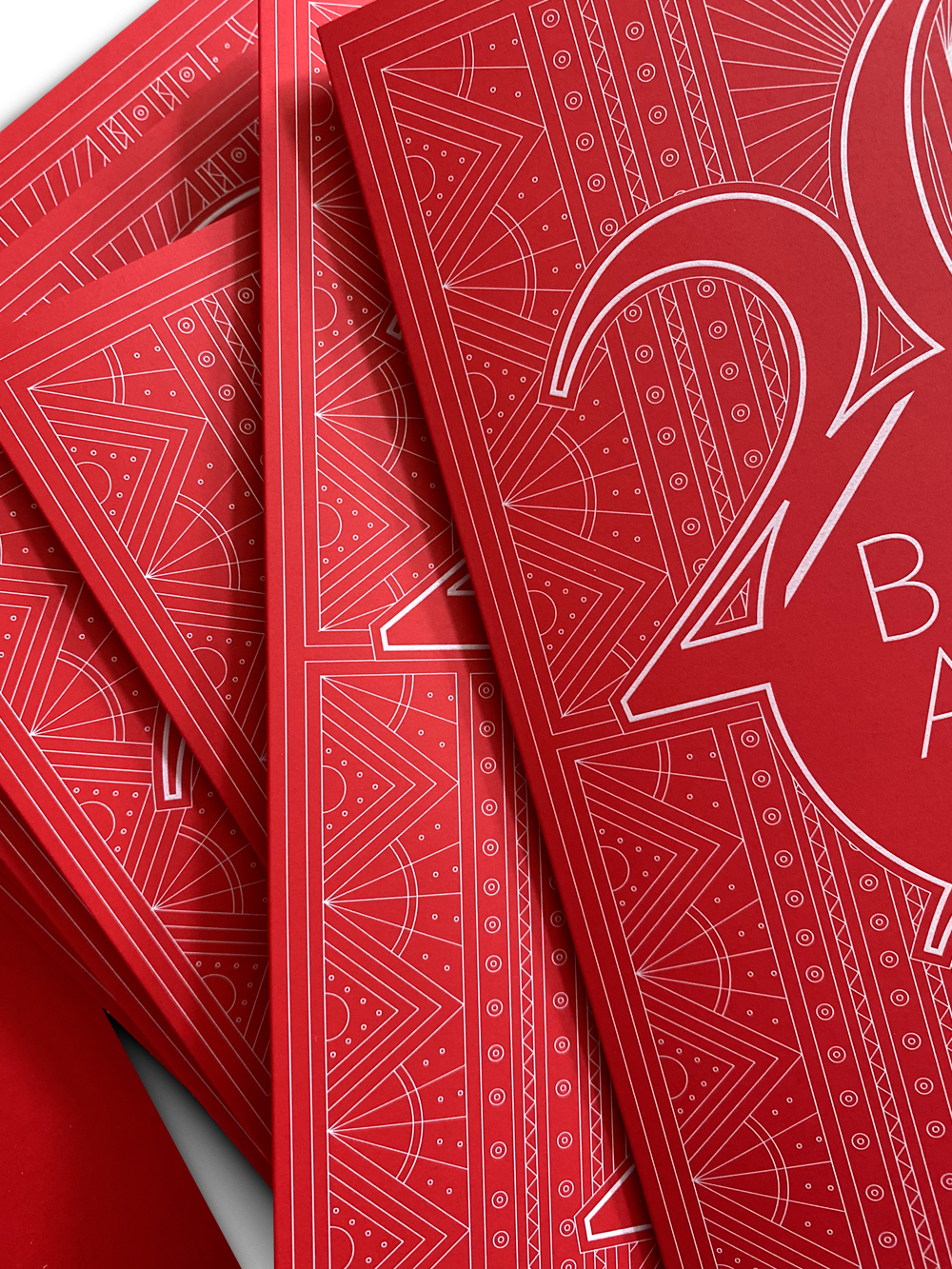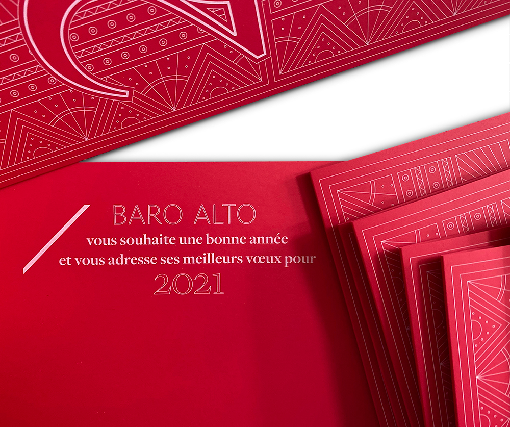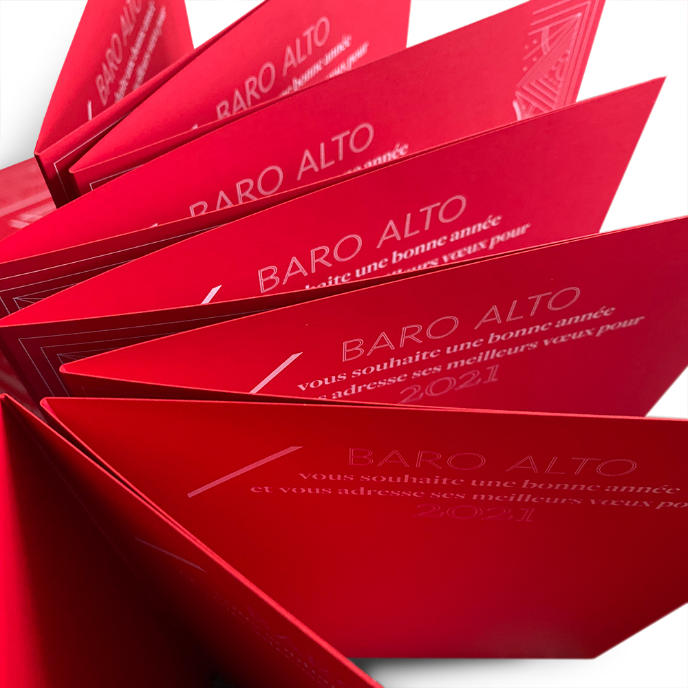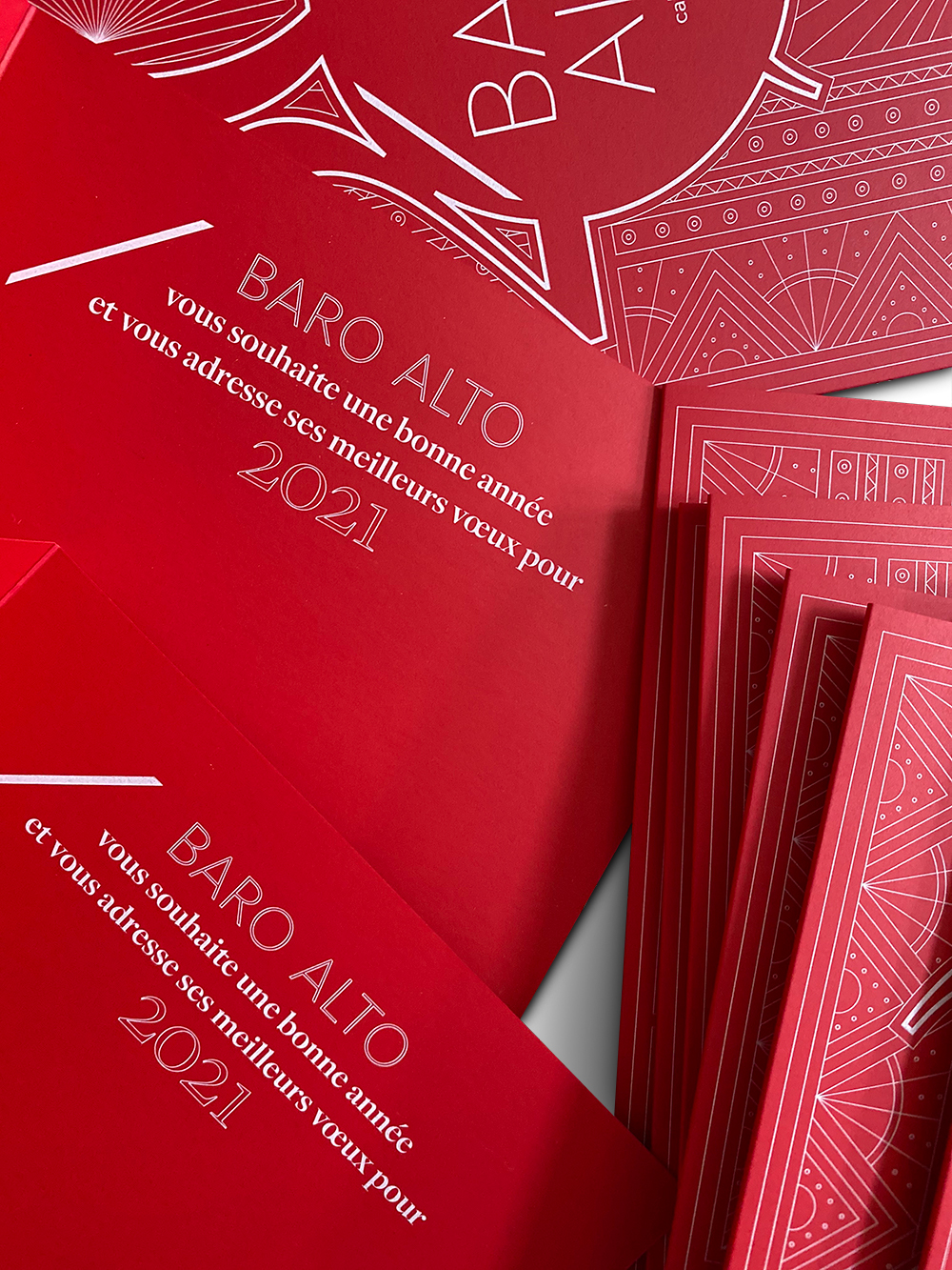 La carte est imprimée en blanc sur papier rouge Curious Skin en 270g. Les enveloppes ont été choisies dans la gamme de papier Curious Metallics, Cryogen White, en 120g.