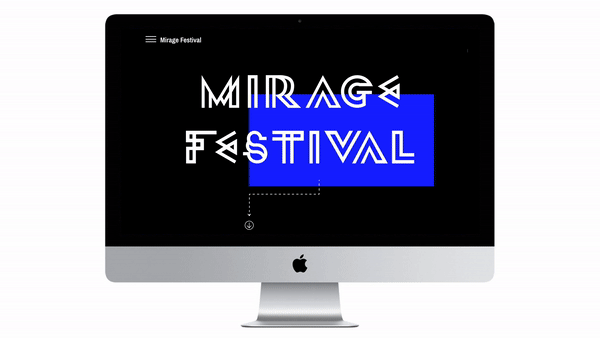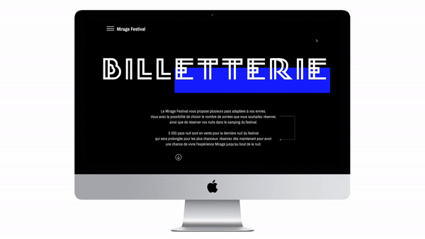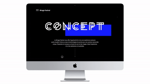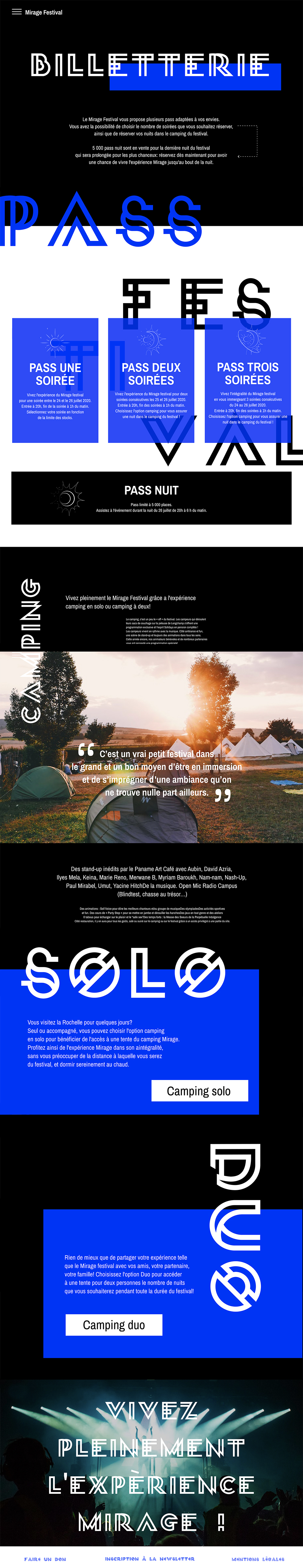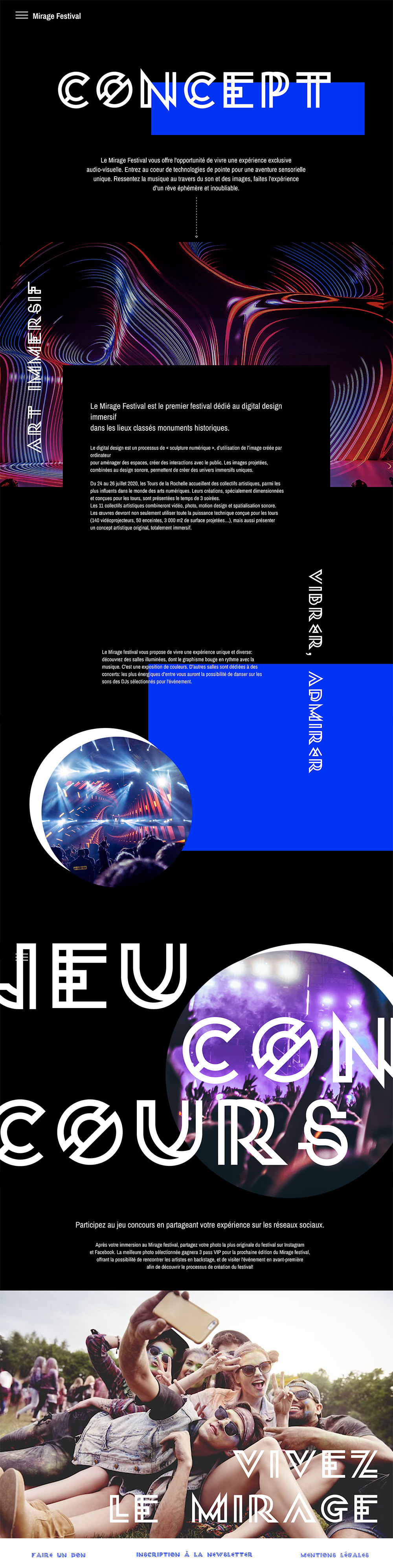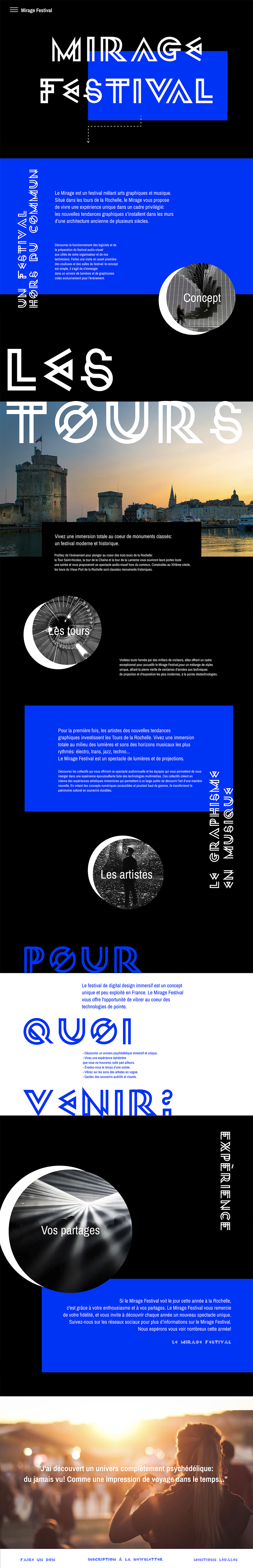 Création du site fictif d'un festival audio-visuel fictof: le Mirage Festival. Vivez l'aventure du mirage où musique et lumières rythment votre visite. Émerveillez-vous au coeur d'installations uniques où le graphisme s'empare des tours de la Rochelle, monuments classés.